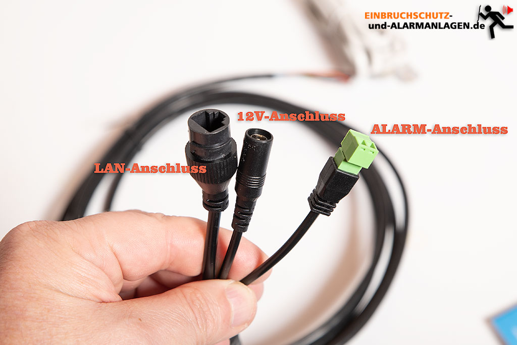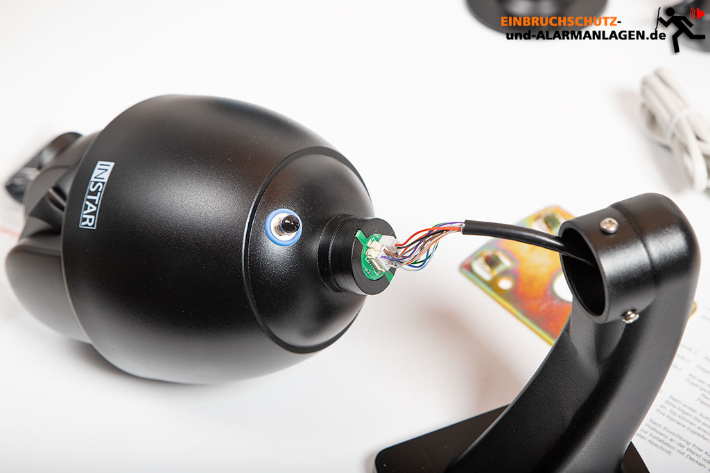 Um die Kamera in Betrieb zu nehmen muss man sich zunächst entscheiden ob man sie an der Wand oder Decke montieren möchte. Anschließend fädelt man das mitgelieferte Anschlusskabel (ca. 3m) durch den entsprechenden Halter und steckt die kleinen Platinenstecker am oberen Ende der Kamera ein. Die Stecker kann man nicht verdrehen oder verwechseln, da diese eine unterschiedliche Größe besitzen und nur in einer Richtung passen. Der Halter wird dann ganz einfach über drei Schrauben an der Kamera montiert.