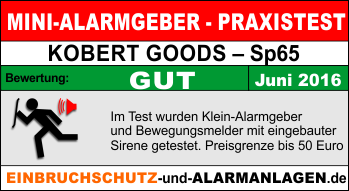 Sehr positiv hat uns im Praxistest der Alarmgeber SP65 der Firma Kopert Goods überrascht. Dieser Alarmgeber ist bei Amazon unter 20 Euro erhältlich und eignet sich zum Schützen von Fenstern, Türen und Vitrinen. Das Gerät ist einfach zu installieren und ist durch ein teilweise mit Metall verkleidetes Gehäuse sogar recht robust konstruiert. Eine Zerstörung durch Einbrecher dürfte bei diesen Gerät zwar sicherlich auch möglich sein, jedoch wird es etwas mehr Zeit beanspruchen als bei reinen Kunststoff-Gehäusen. Das Ausschalten des Alarms ist nur durch eine vierstellige Zifferneingabe am Gerät selbst möglich. Nach Einlegen der Batterien kann man die Ziffernfolge frei selbst festlegen.