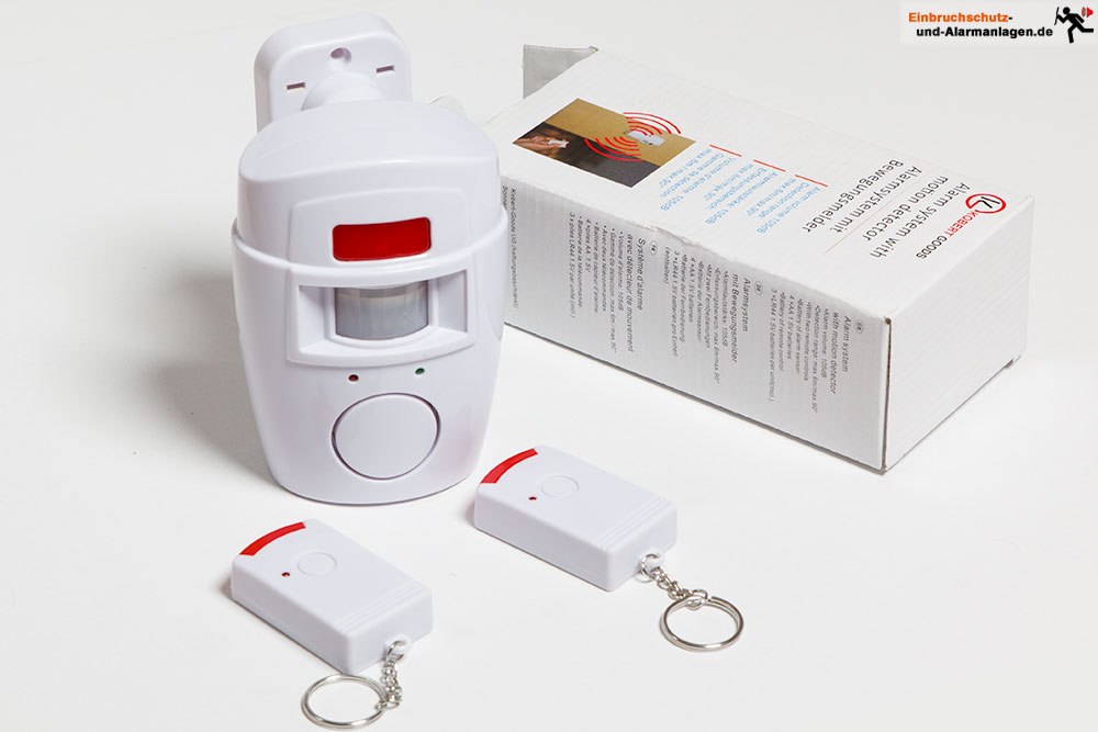 Vom gleichen Hersteller wie dem zuvor beschriebenen Vitrinenalarm gibt es auch einen Bewegungsmelder mit eingebauter Sirene. Zum Lieferumfang gehören hier zudem zwei kleine Infrarot-Fernbedienungen, die zum Aktivieren und Deaktivieren des Bewegungssensors dienen.