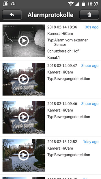 So kann man beispielsweise in der App natürlich das Livebild in SD oder HD Auflösung beobachten. Man sieht also jederzeit was in der Wohnung vorgeht. Man kann aber auch den Bewegungsalarm aktivieren und bei Bewegung automatisch das Video auf Speicherkarte ablegen lassen. Über einen Button kann man dann jederzeit die Alarmhistorie anzeigen lassen. Hier sieht man genau wann ein Alarm ausgelöst wurde und ein Vorschaubild. Per Klick kann man dann die entsprechende Sequenz abspielen. Wie viel Minuten bei einer Bewegung aufgezeichnet werden soll, kann man in den Einstellungen wählen (1 bis 3 Minuten).