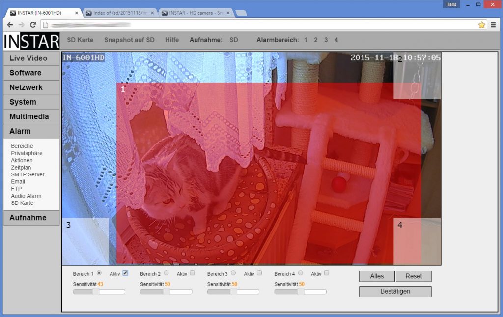 Interessanter sind für die Videoüberwachung natürlich die Alarm-Einstellungen bzw. die Bewegungserkennung. Man kann vier Bereiche (Zonen) im Bild markieren. Wenn in einem Bereich einem Bewegung auftritt, kann eine Aktion ausgelöst werden. Die Empfindlichkeit ist für jeden Bereich individuell einstellbar, so dass beispielsweise ein leicht wackelnder Vorhang oder ein Lüfter nicht gleich die Bewegungserkennung aktiviert. Per Klick lassen sich auch einzelne Bereiche schnell ein- oder ausschalten.